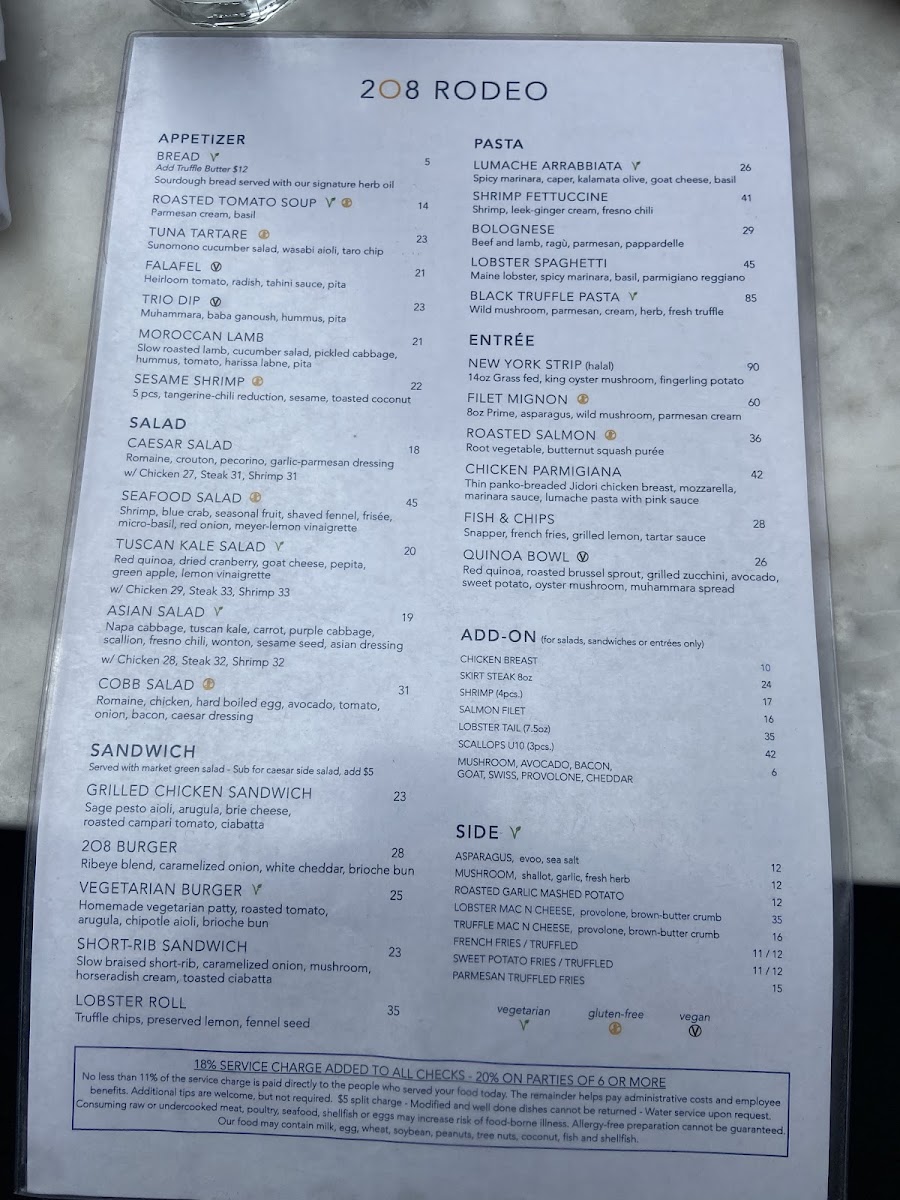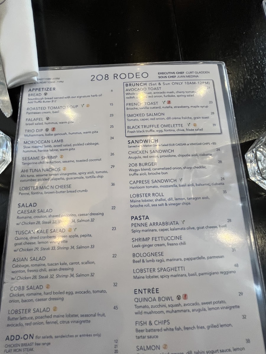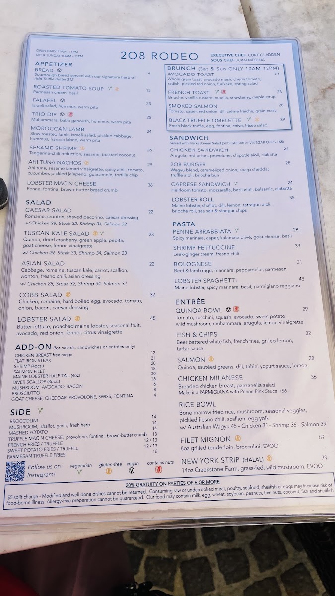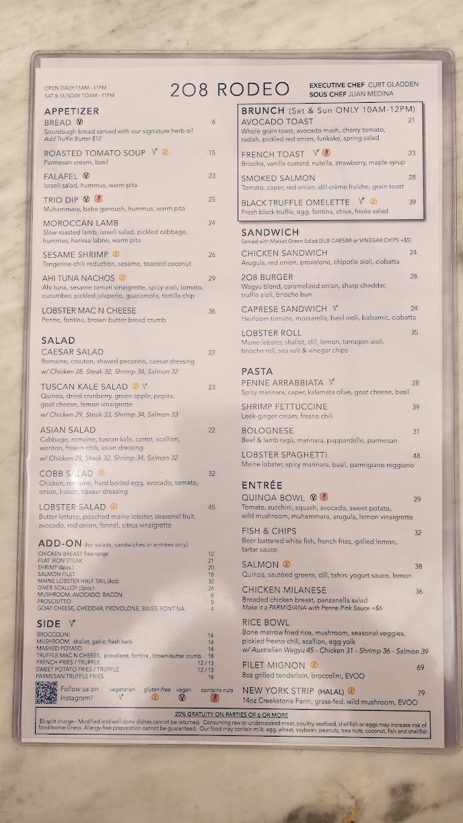 At 208 Rodeo, you're in for a dining experience that reflects the glamour of Beverly Hills. Nestled in the heart of Rodeo Drive, the menu is a delightful blend of sophisticated flavors and fresh ingredients. From signature dishes that combine international influences to local specialties, every bite is crafted with attention to detail. Whether you're in the mood for a casual bite or a more indulgent meal, the offerings cater to every palate. Don't miss the expertly prepared entrees, paired with fine wines and refreshing beverages, making each meal feel like an occasion. With its vibrant atmosphere, 208 Rodeo Menu promises a memorable culinary journey in one of the world’s most iconic neighborhoods.