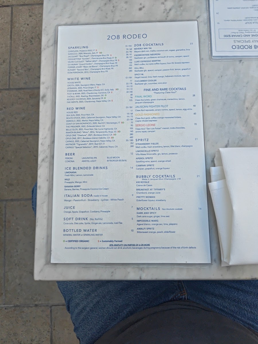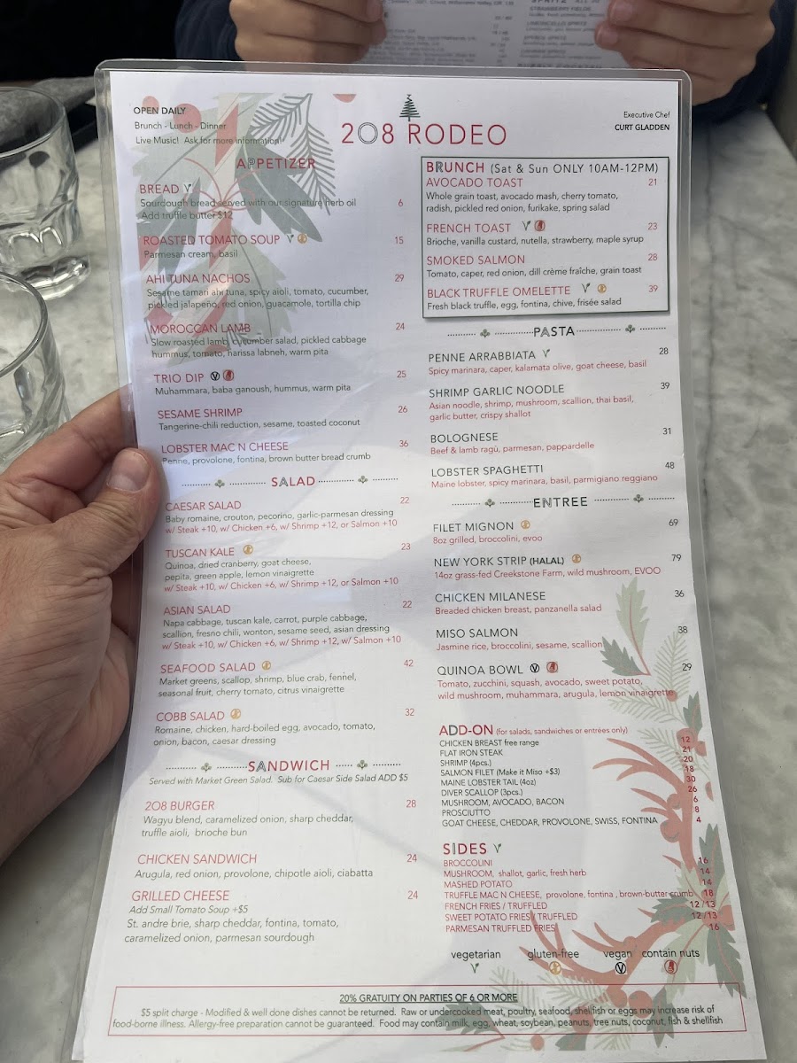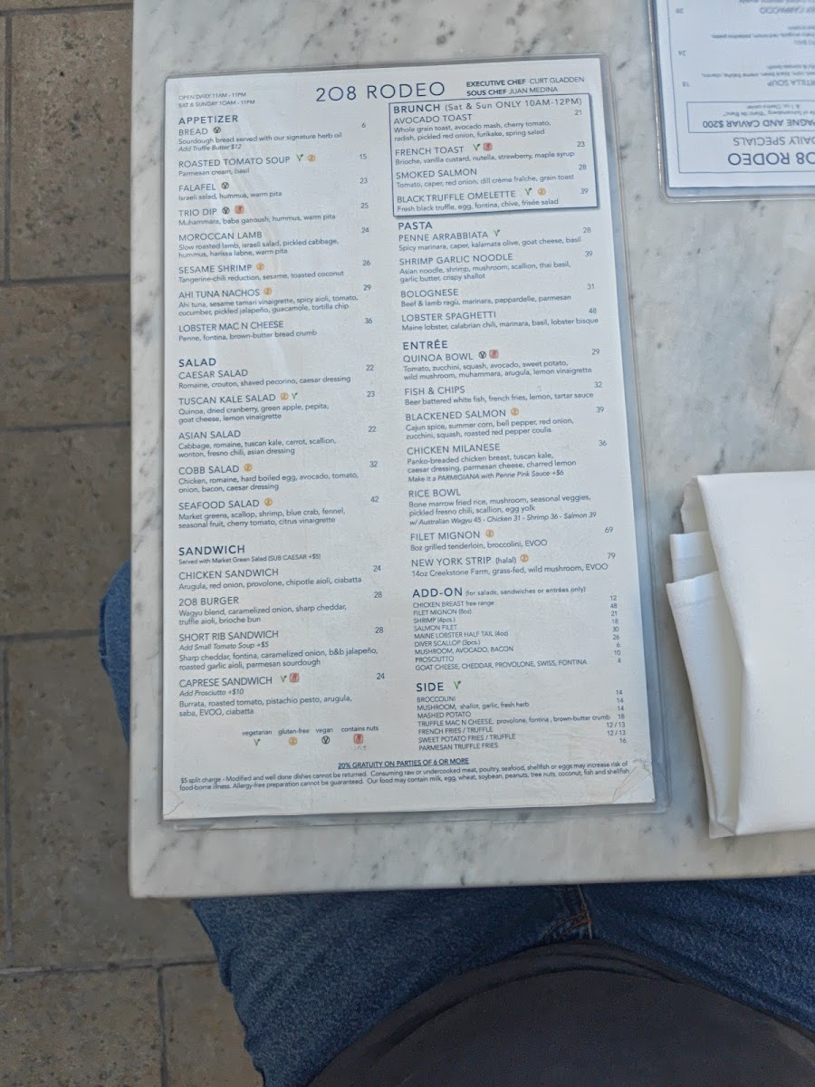 At 208 Rodeo, you're in for a dining experience that reflects the glamour of Beverly Hills. Nestled in the heart of Rodeo Drive, the menu is a delightful blend of sophisticated flavors and fresh ingredients. From signature dishes that combine international influences to local specialties, every bite is crafted with attention to detail. Whether you're in the mood for a casual bite or a more indulgent meal, the offerings cater to every palate. Don't miss the expertly prepared entrees, paired with fine wines and refreshing beverages, making each meal feel like an occasion. With its vibrant atmosphere, 208 Rodeo Menu promises a memorable culinary journey in one of the world’s most iconic neighborhoods.
